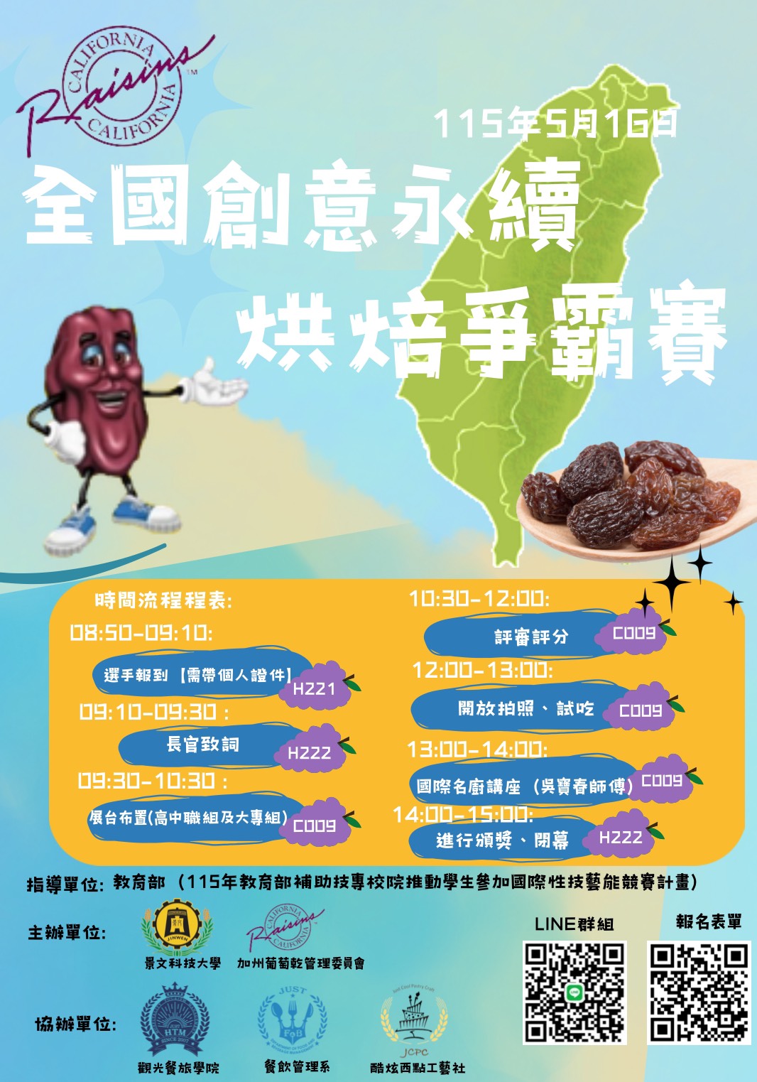 - 2026加州葡萄乾全國創意永續烘焙爭霸賽-簡章點我下載 (檔案類型:pdf) 2026加州葡萄乾全國創意永續烘焙爭霸賽-流程海報點我下載 (檔案類型:jpg) 2026加州葡萄乾全國創意永續烘焙爭霸賽-海報點我下載 (檔案類型:png)